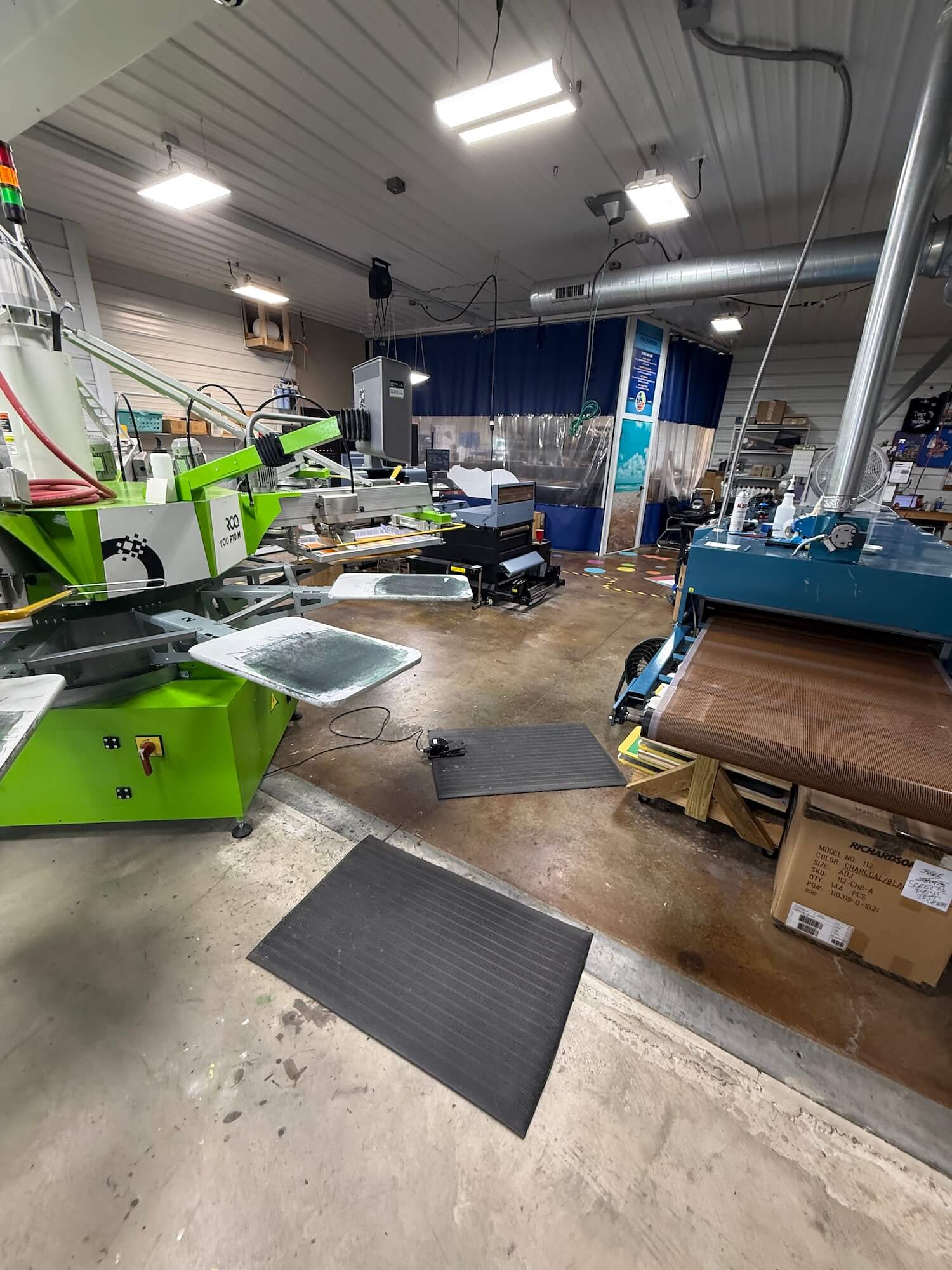Create art → burn screens → wash screens → dry screens → tape screens → set up → print → tear down… and then do it all over again for the next job.